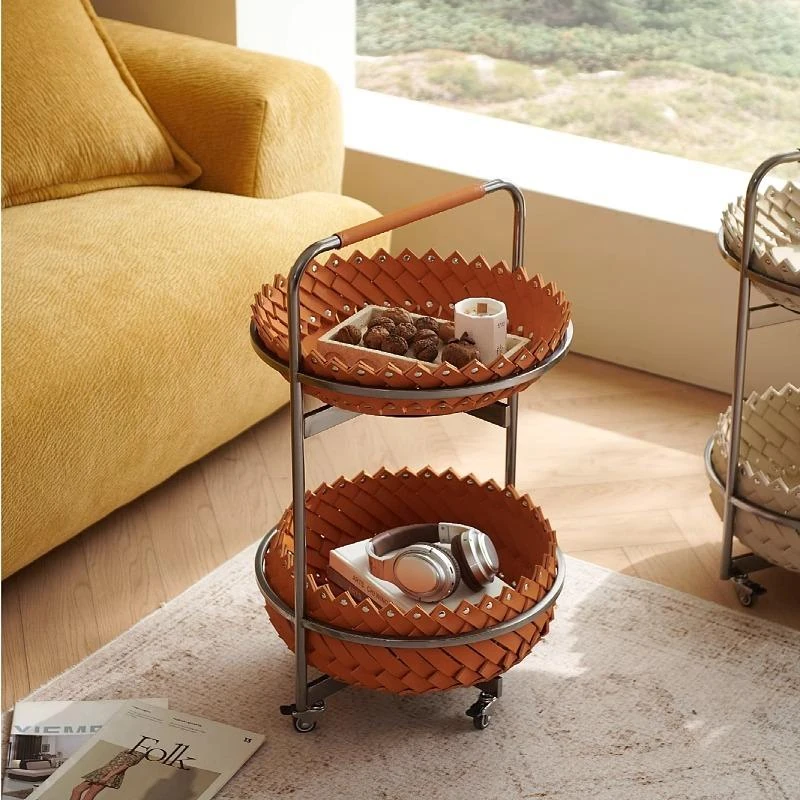 イタリアンラグジュアリーソファサイドテーブル 馬鞍レザー製ラウンドカート デザイナーズ高級ホーム用編み込み収納バスケット コーナーテーブルでおしゃれな空間を演出!