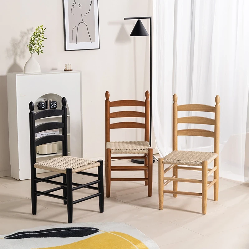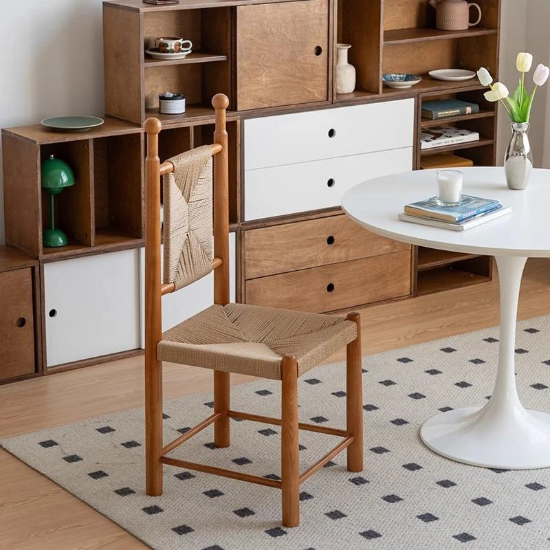 Rustic Vintage Solid Wood Rope-Woven Dining Chair & Desk for Home – Comfortable Backrest for Makeup, Relaxation, and Daily Use in Japanese Scandinavian Style