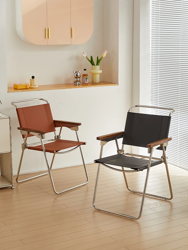 Scandinavian Vintage Folding Chair with Armrests – Modern Minimalist Design, Stainless Steel & Saddle Leather, Perfect for Home and Office Use, Trendy and Comfortable
