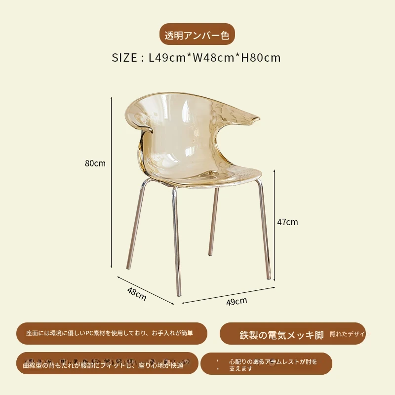 クリーム風アクリルダイニングチェア|透明で厚手のプラスチック製、快適な背もたれとアームレスト付き|金属フレームで洗練されたデザインの会議・接待用リラックスチェア