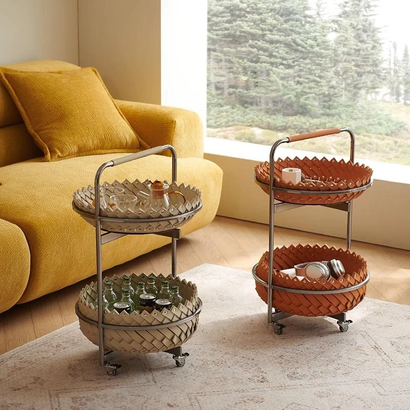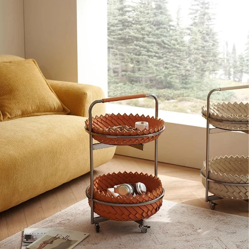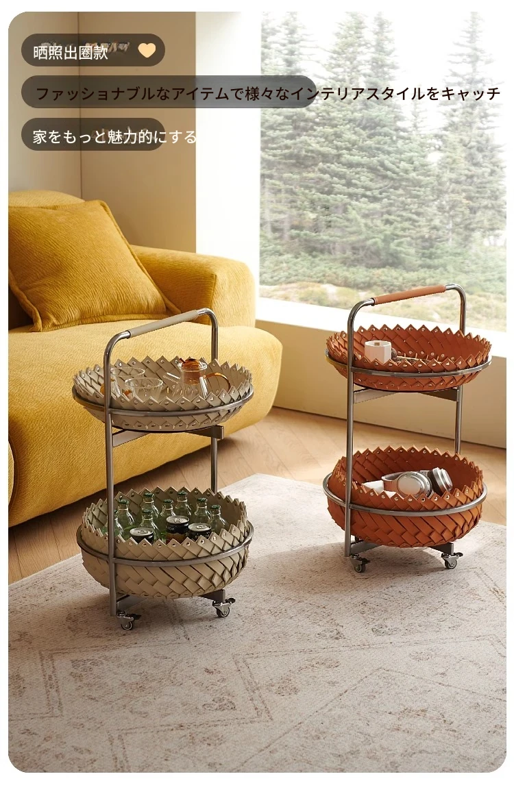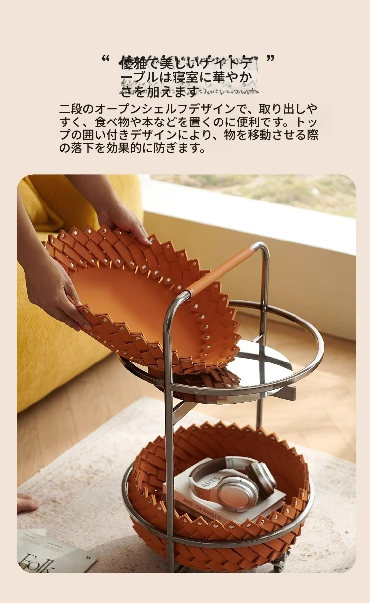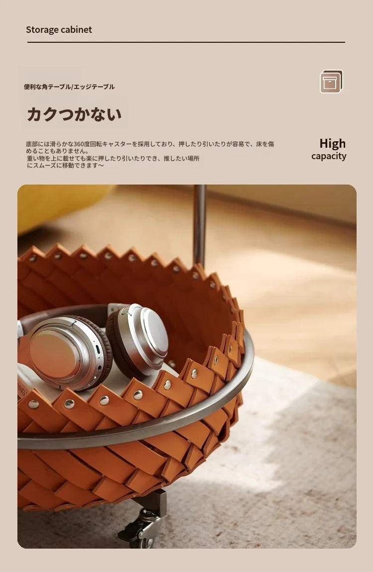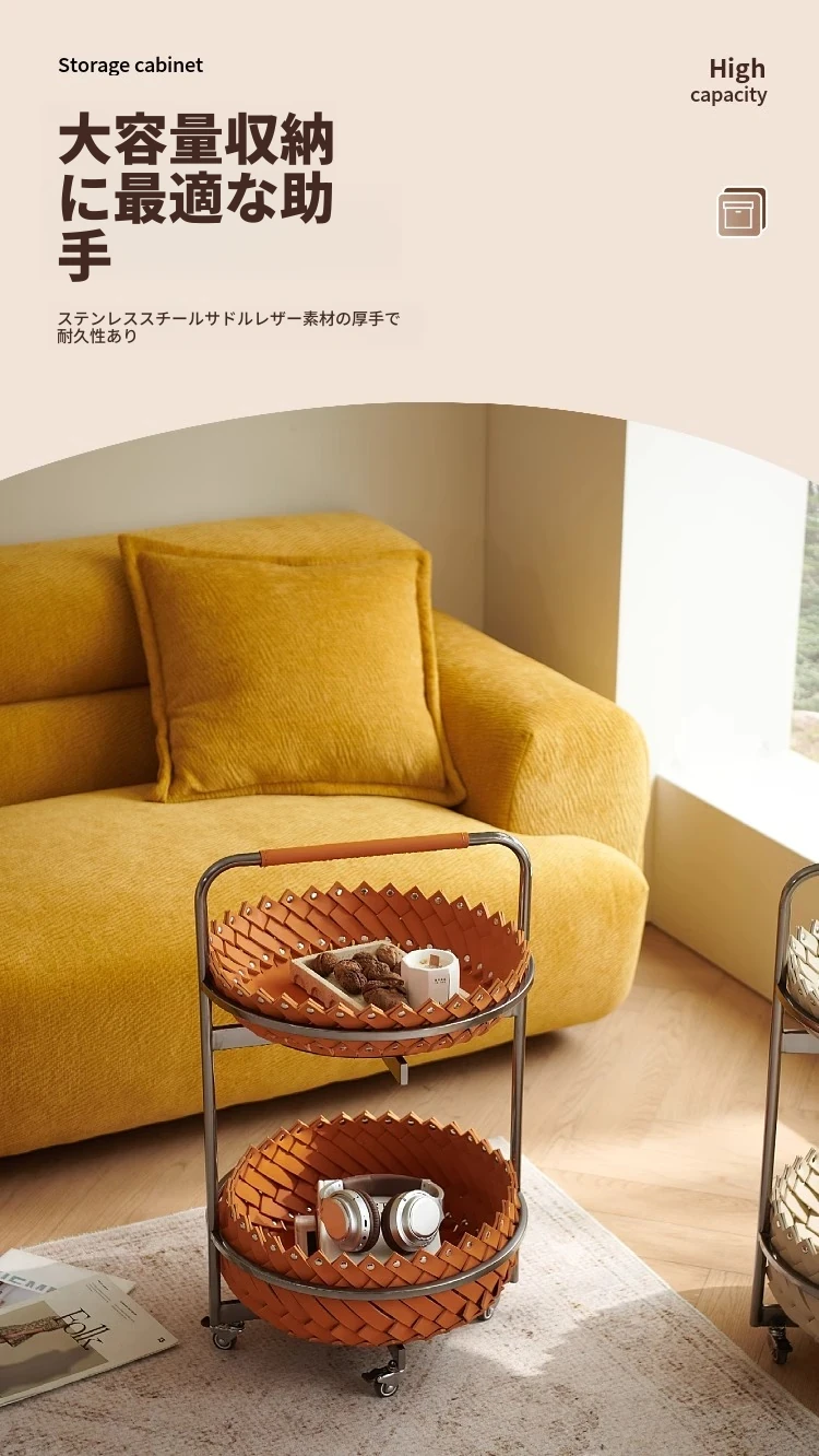 イタリアンラグジュアリーソファサイドテーブル 馬鞍レザー製ラウンドカート デザイナーズ高級ホーム用編み込み収納バスケット コーナーテーブルでおしゃれな空間を演出!