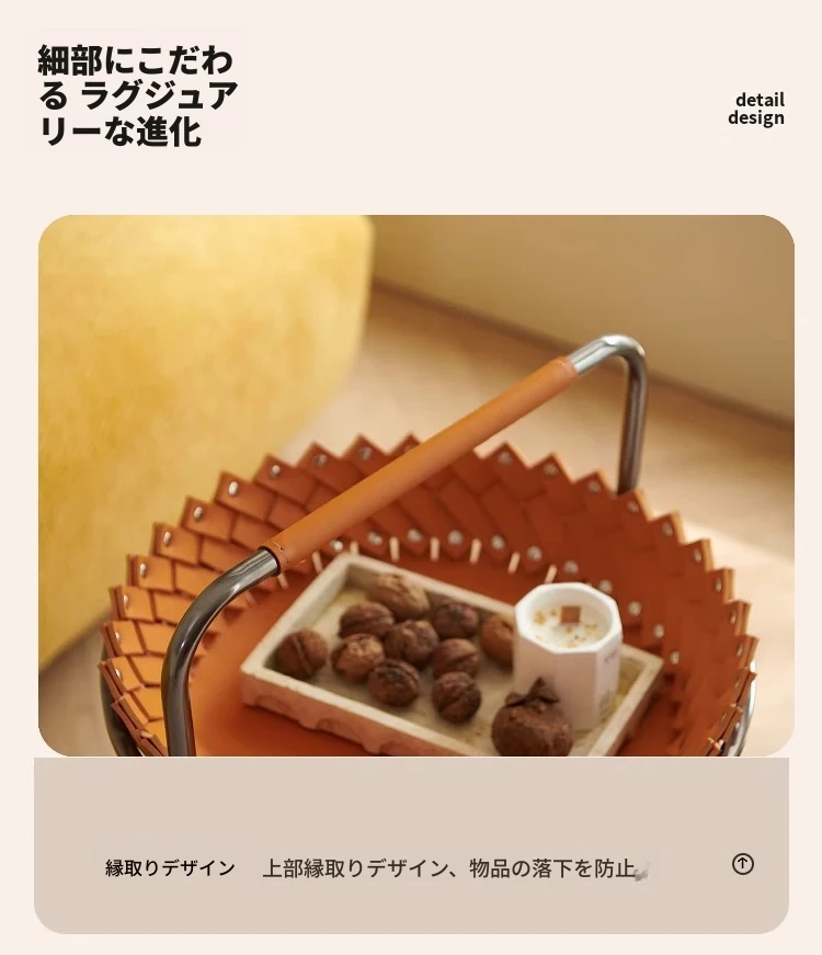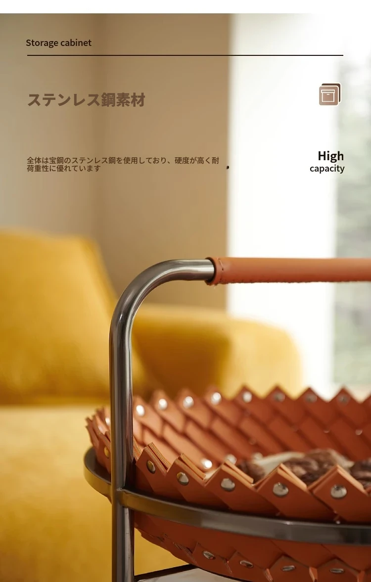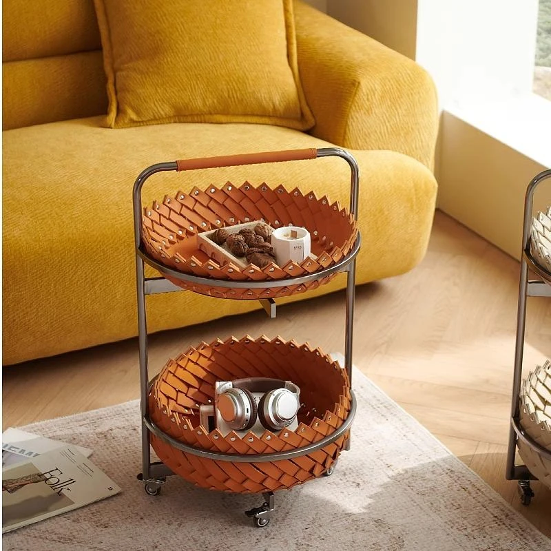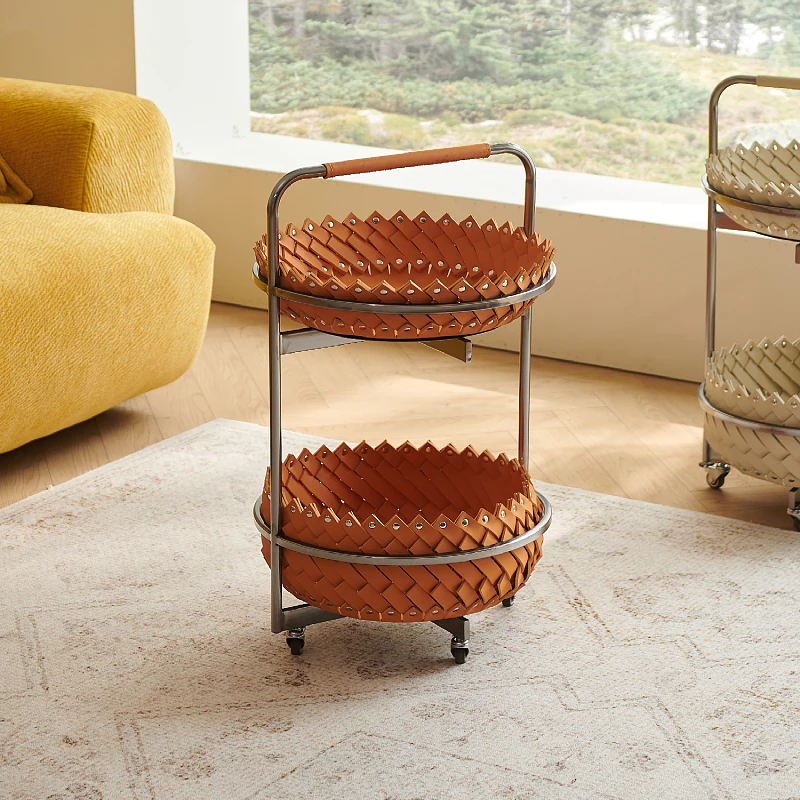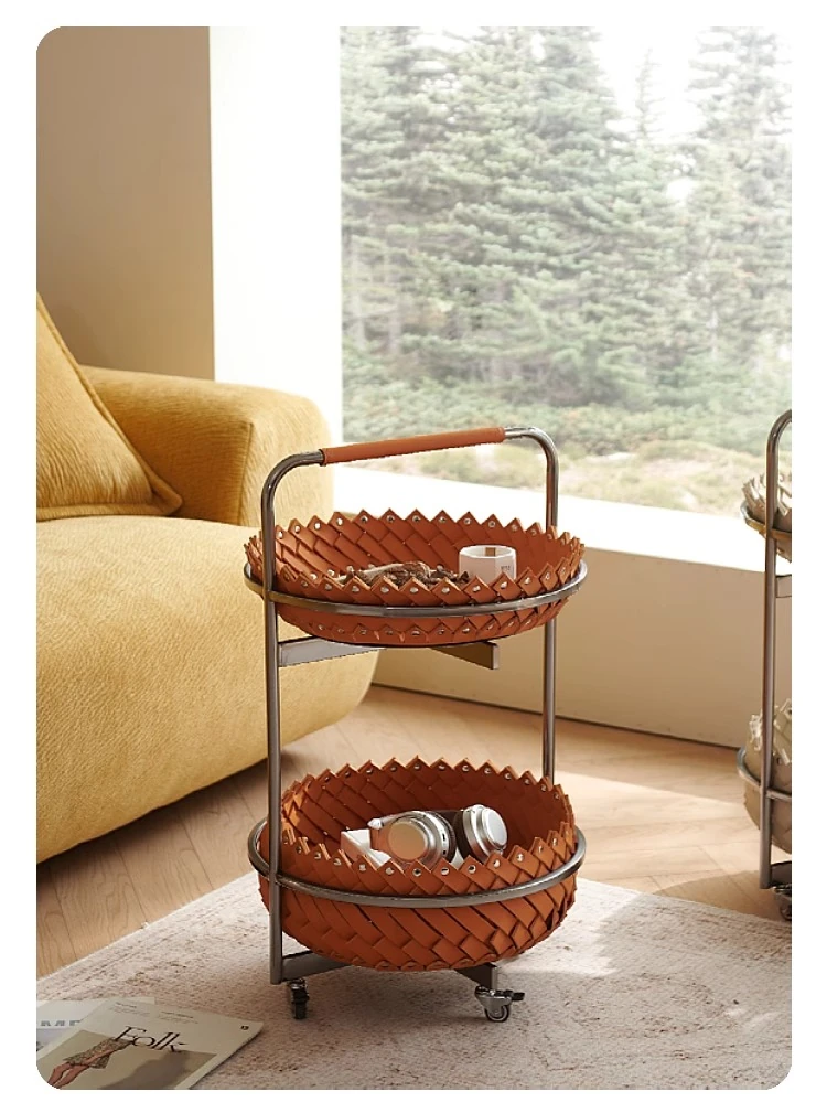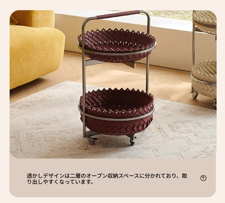 イタリアンラグジュアリーソファサイドテーブル 馬鞍レザー製ラウンドカート デザイナーズ高級ホーム用編み込み収納バスケット コーナーテーブルでおしゃれな空間を演出!