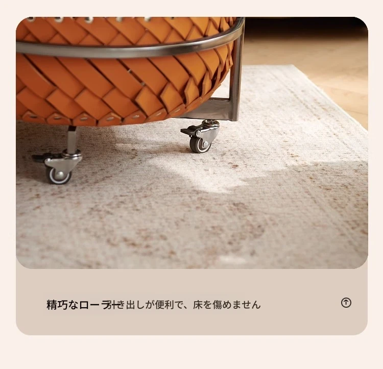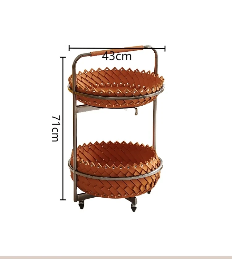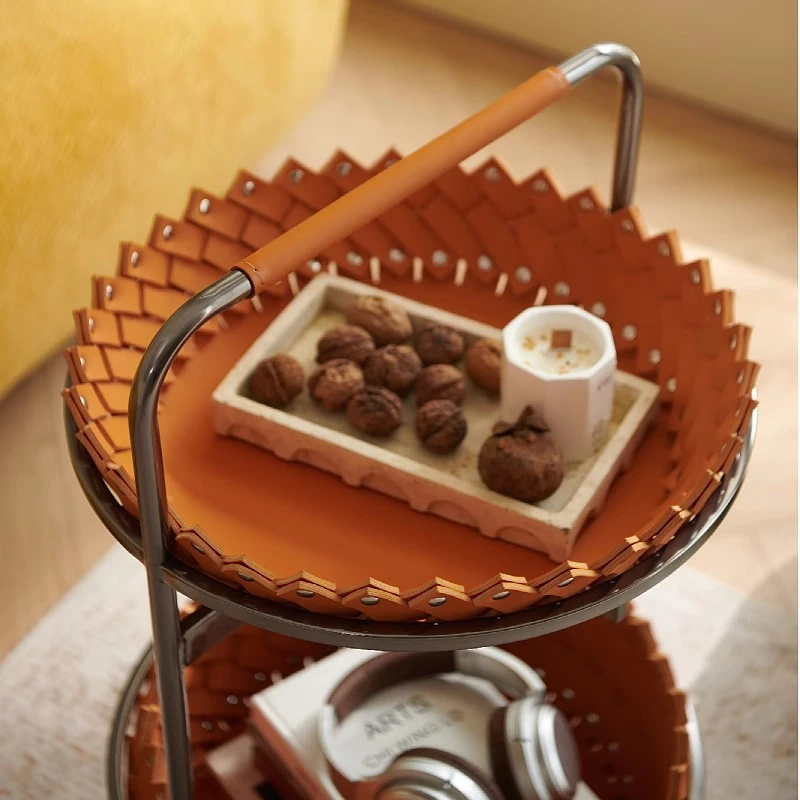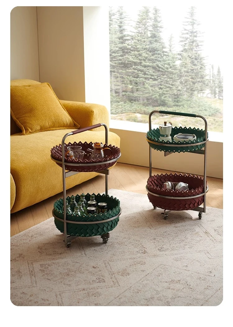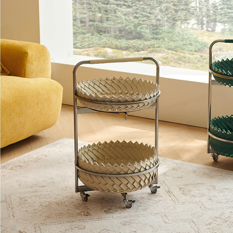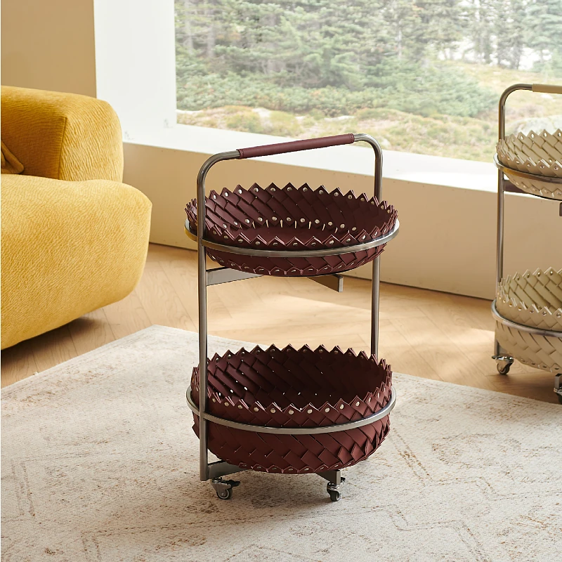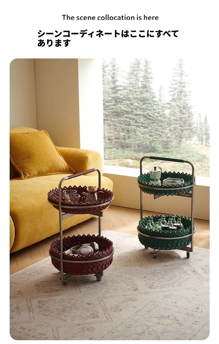 イタリアンラグジュアリーソファサイドテーブル 馬鞍レザー製ラウンドカート デザイナーズ高級ホーム用編み込み収納バスケット コーナーテーブルでおしゃれな空間を演出!