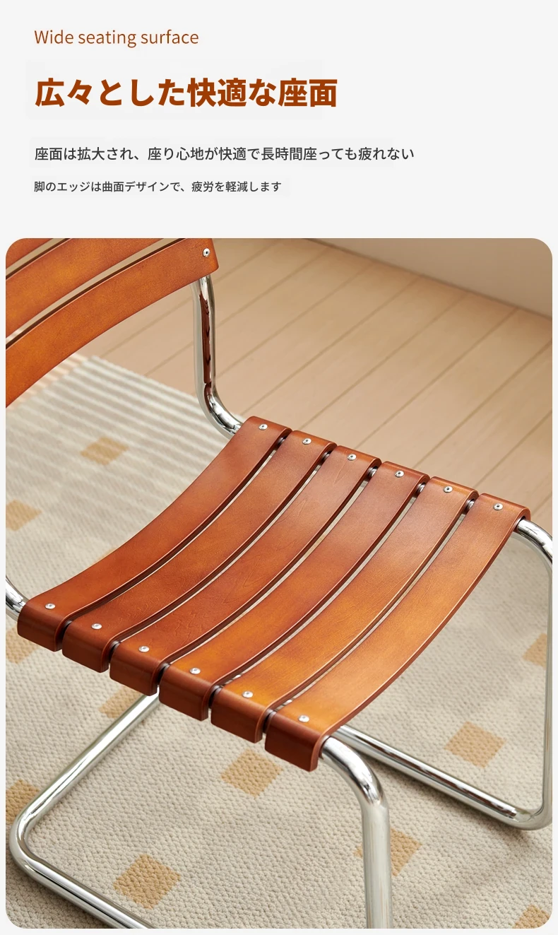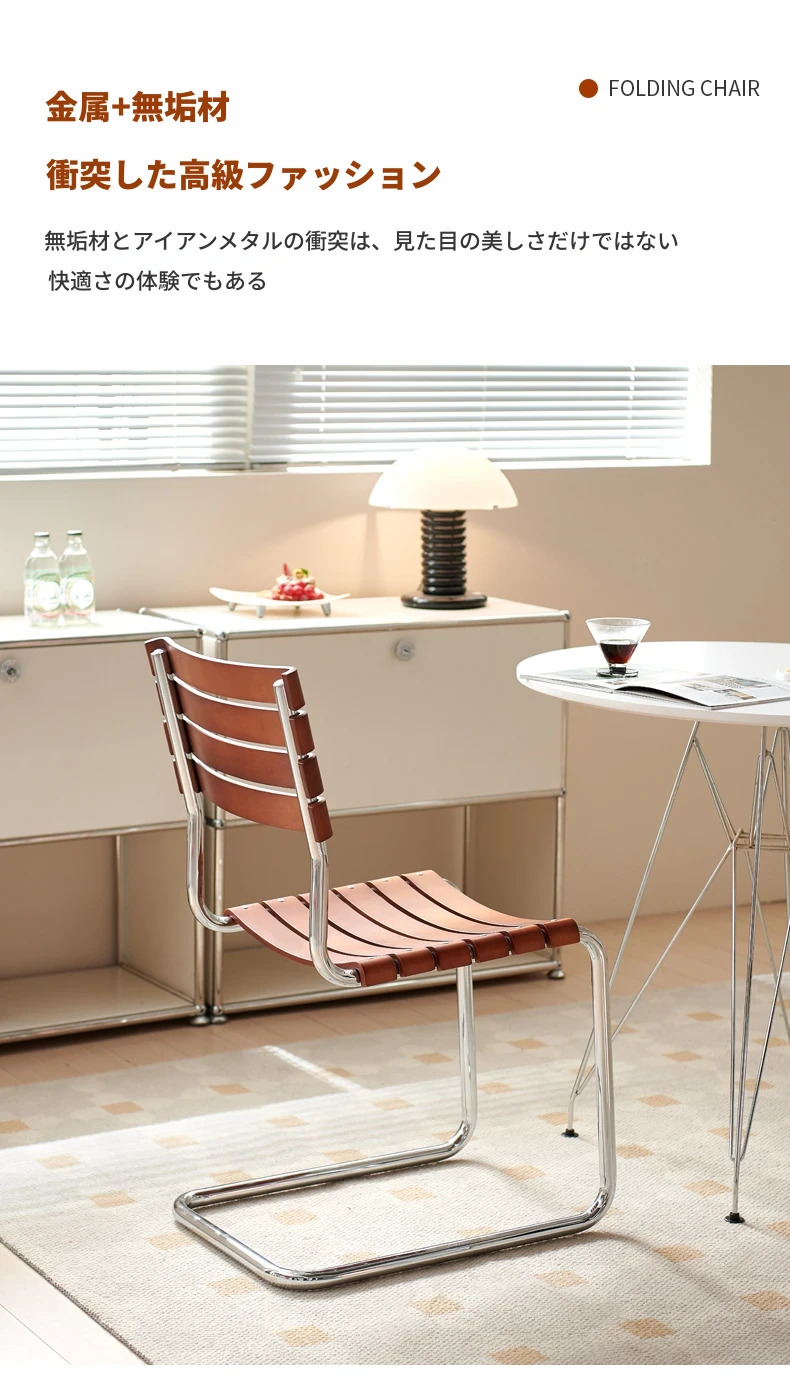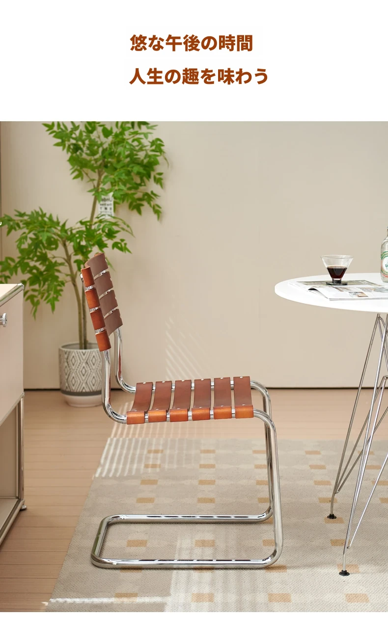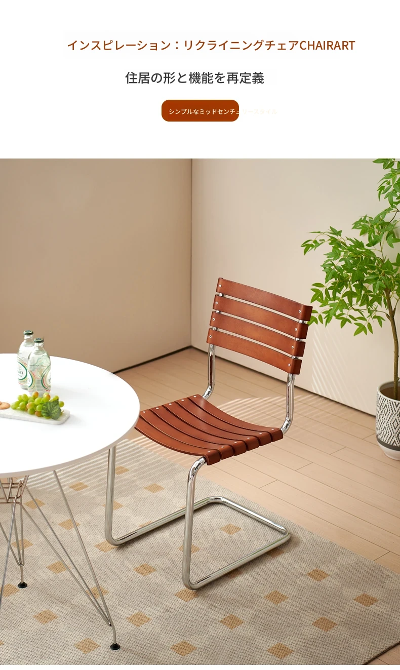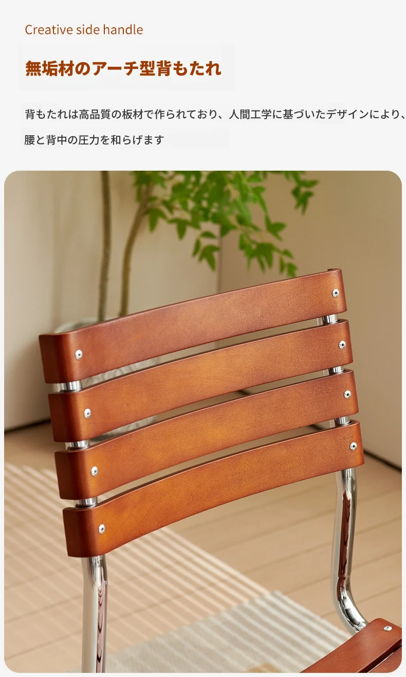D40アームチェアー - ステンレス製アーム付きダイニングチェア、古典的なデザインのレザーチェア。シンプルでモダン、リラックスできる背もたれ付きで、食事やお茶の時間を特別に演出します。
