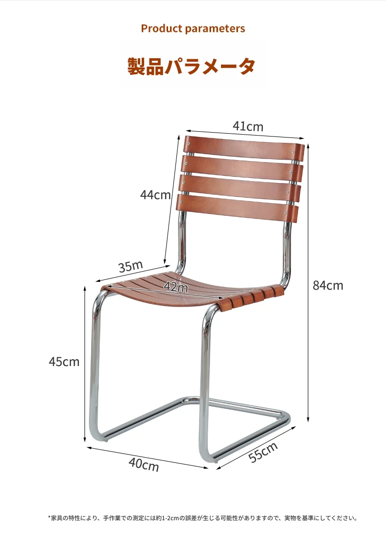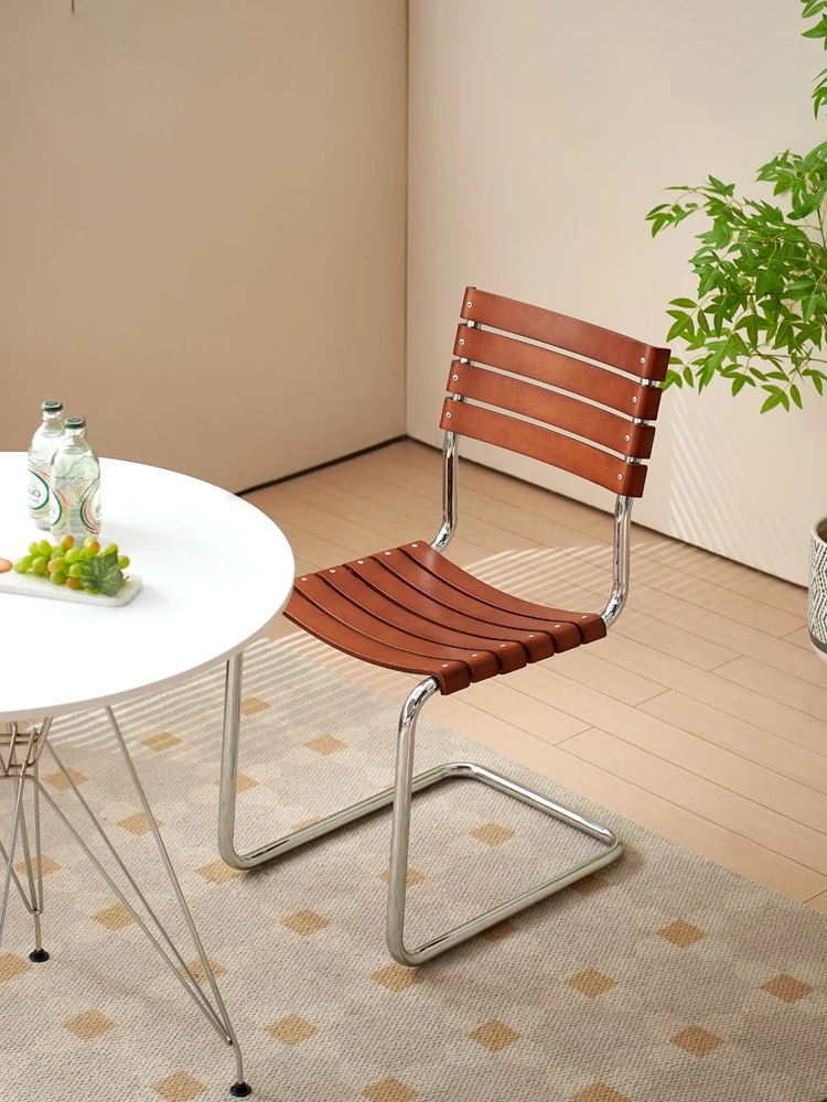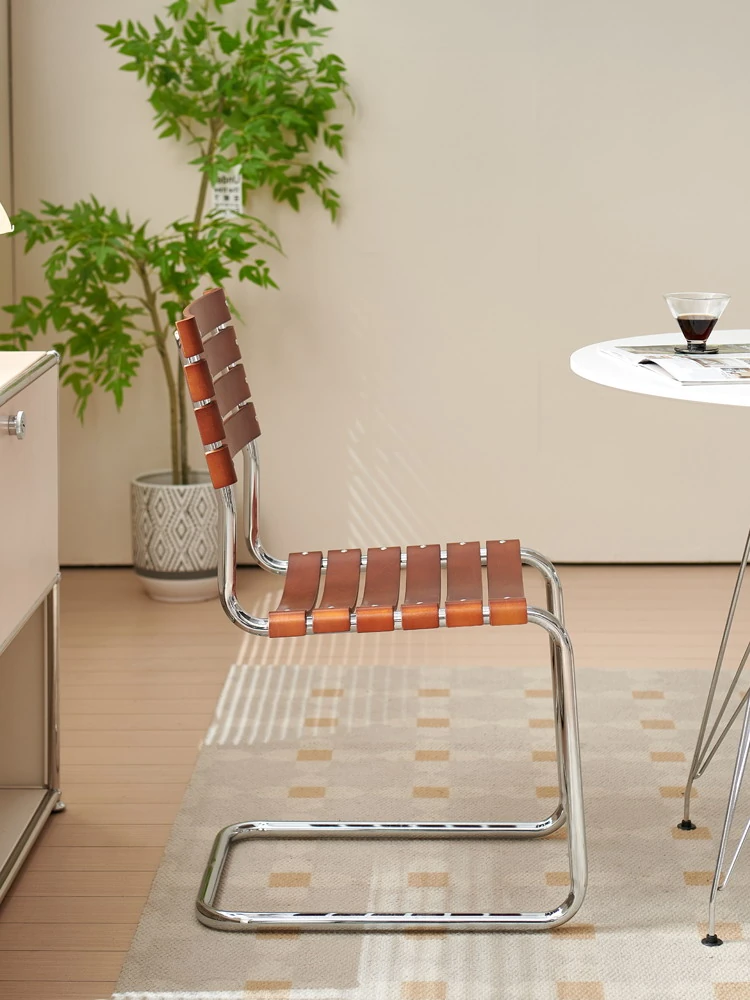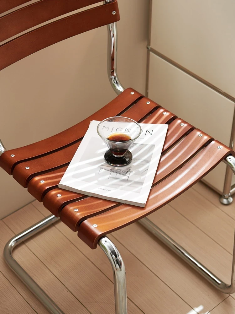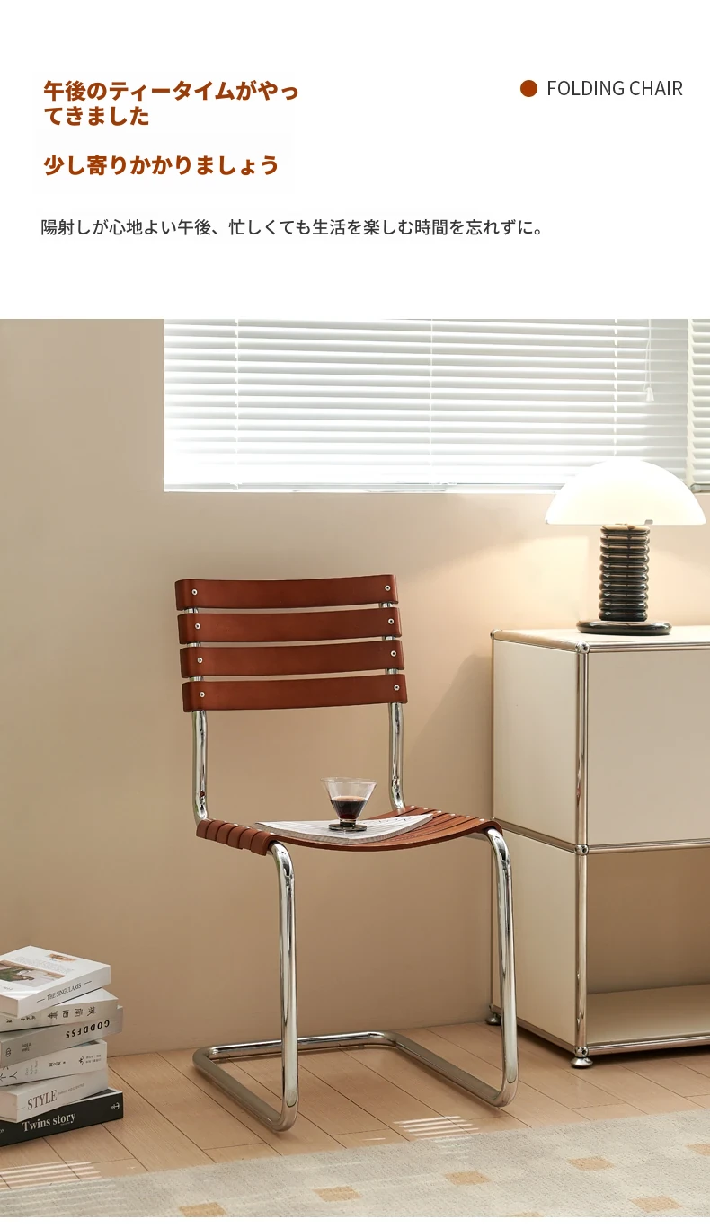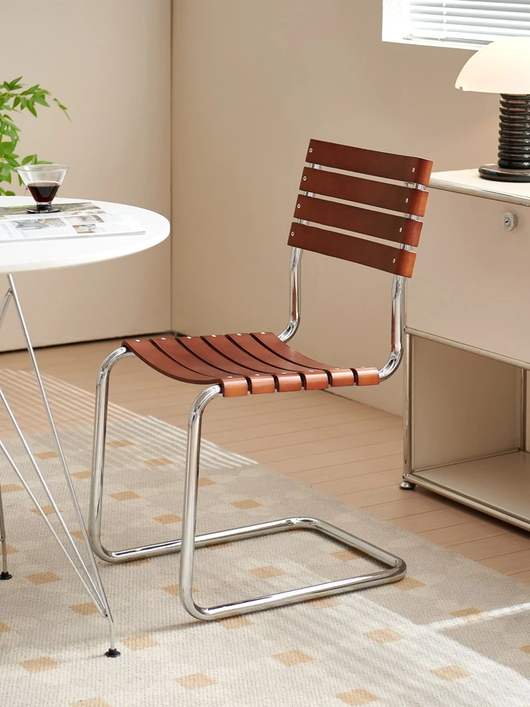 D40アームチェアー - ステンレス製アーム付きダイニングチェア、古典的なデザインのレザーチェア。シンプルでモダン、リラックスできる背もたれ付きで、食事やお茶の時間を特別に演出します。